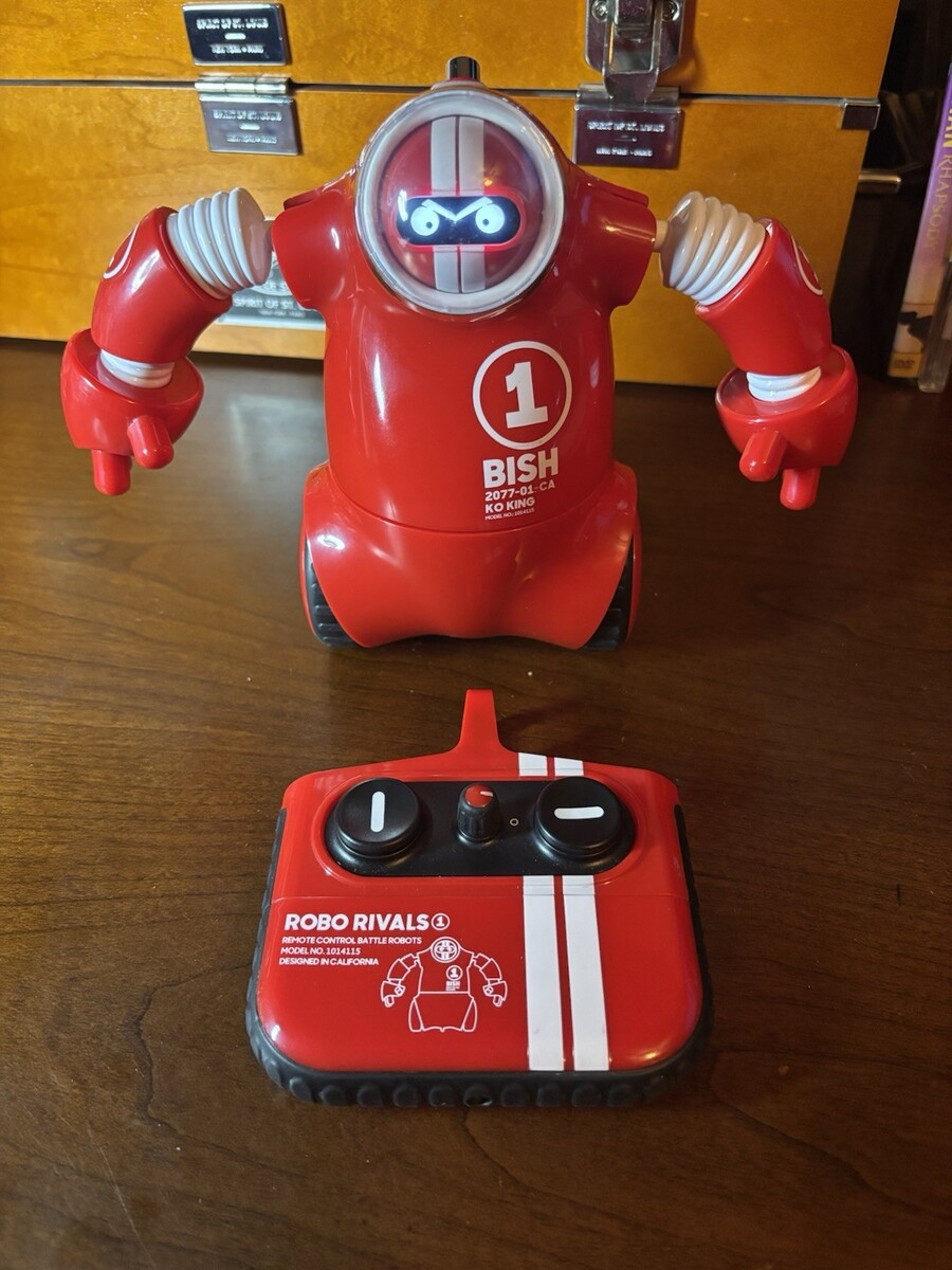 The Sharper Image Robo Rivals Fighter is a red remote-controlled fighting robot designed for ages 5-6. This toy, part of the BattleBots character family, allows kids to engage in exciting robot battles using their control remote. With its recognizable Sharper Image branding and sleek design, this toy promises hours of entertainment for young tech enthusiasts.