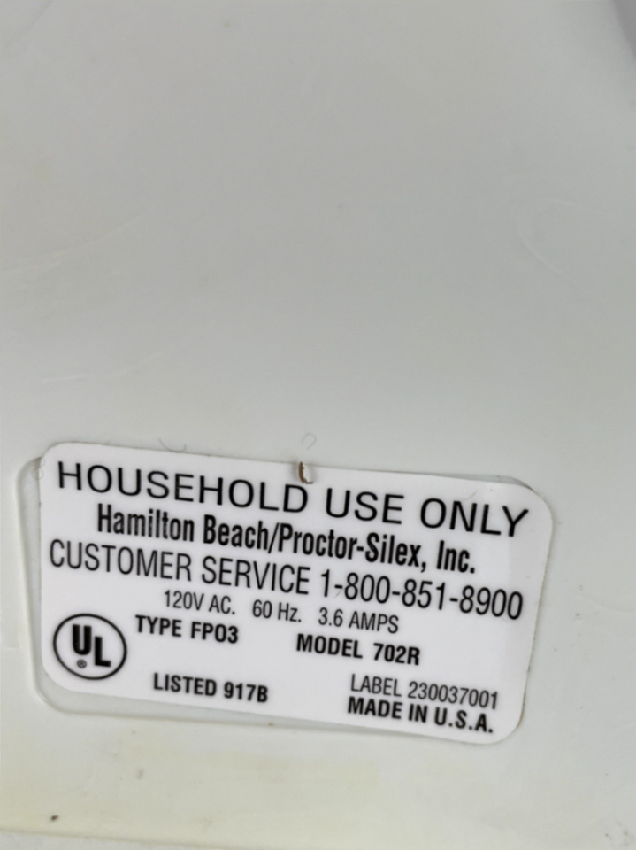 Hamilton Beach Food Processor Model 702R White 120V 3.6AMP 702R Base Unit Only; no other parts/pieces