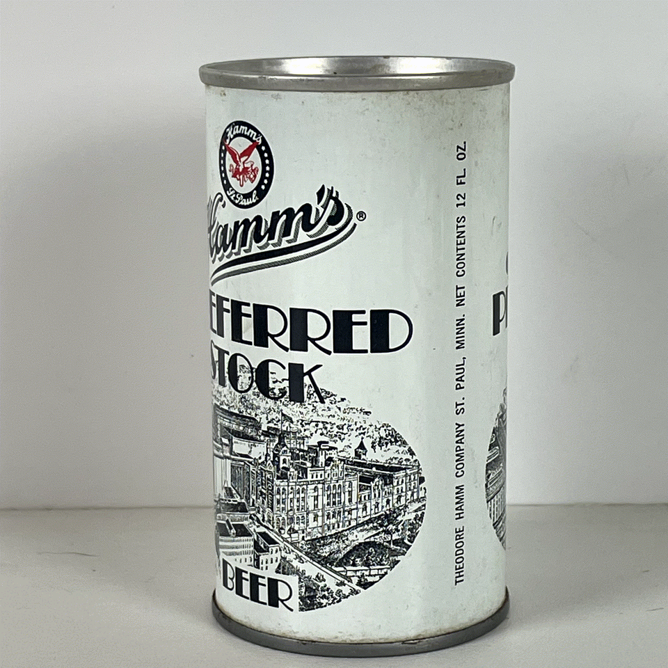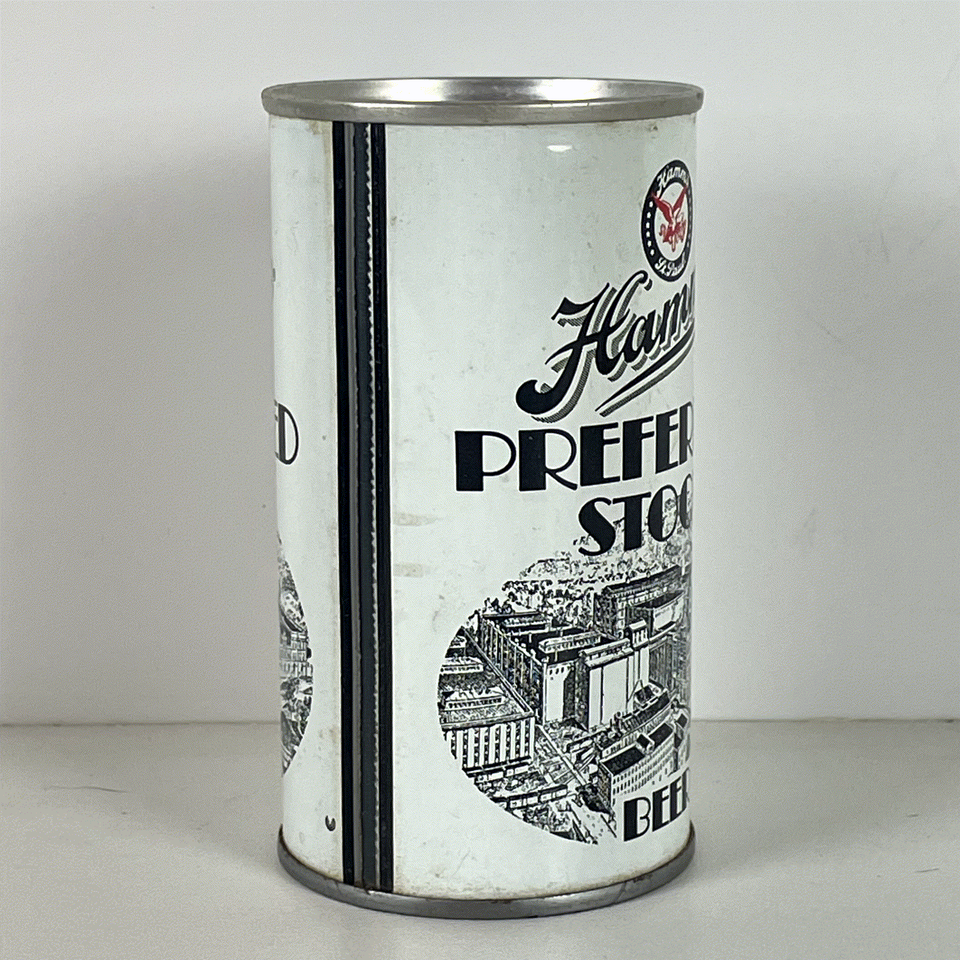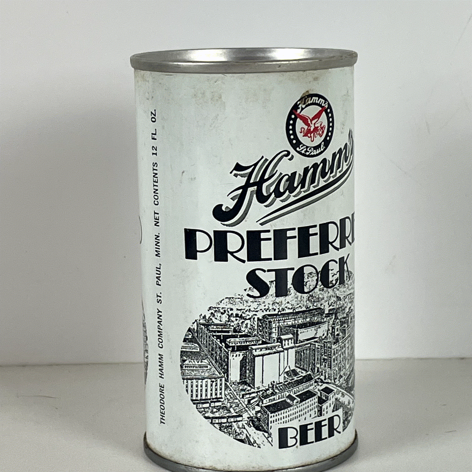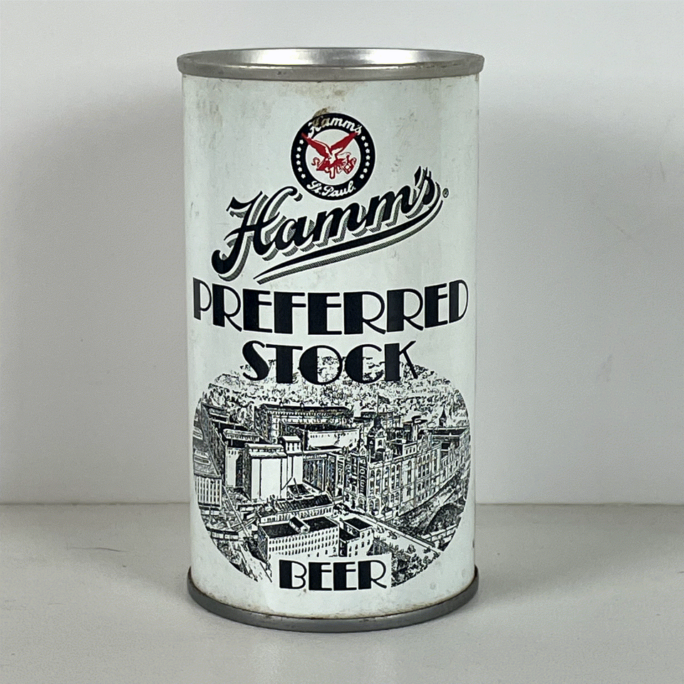 This collectible Hamm's Preferred Stock Beer can is a striking piece of breweriana featuring a classic vintage design. The can is predominantly white with bold black lettering and an intricate black and white illustration of the brewery buildings, showcasing detailed artwork that beer enthusiasts and collectors will appreciate. It prominently displays the Hamm's logo with the iconic red eagle, emphasizing its heritage from St. Paul, Minnesota.