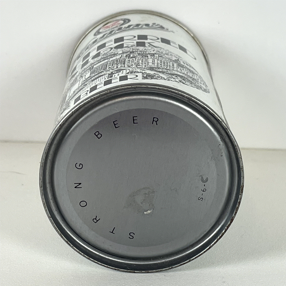 Crafted from metal with an embossed top, this 12 fluid ounce can offers a tactile and authentic feel. The simple yet elegant color scheme combined with the detailed brewery scene makes it a unique decorative item or a valuable addition to any vintage beer can collection. Its cylindrical shape and traditional pull-tab top reflect the era it was produced in, making it a nostalgic find for fans of Americana and beer memorabilia.
