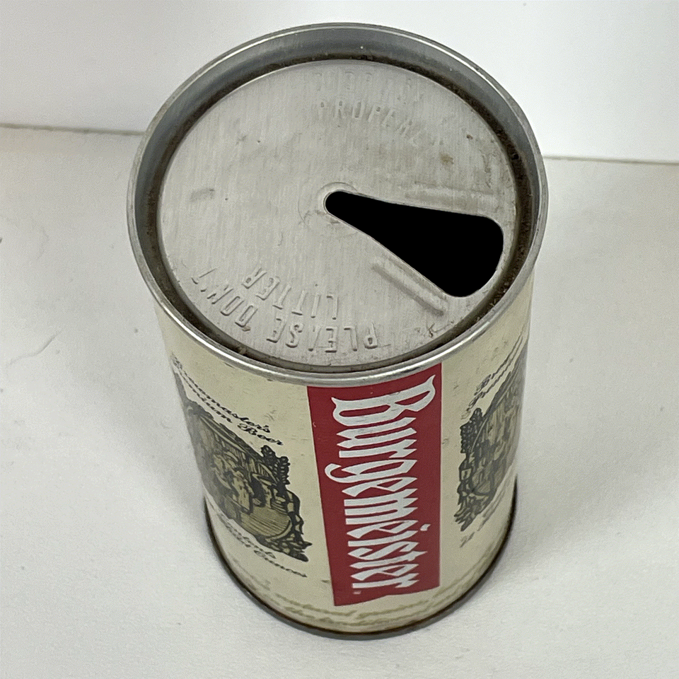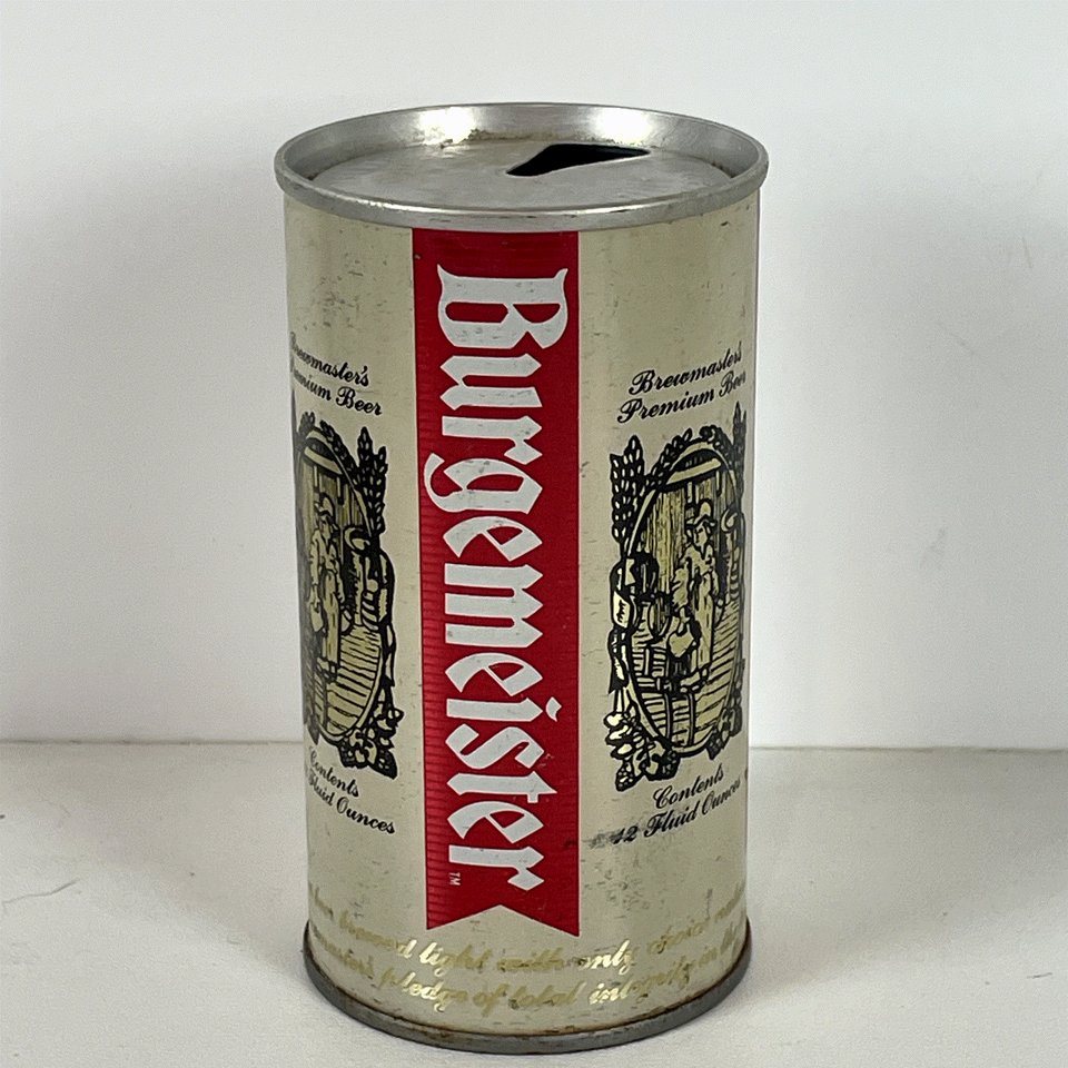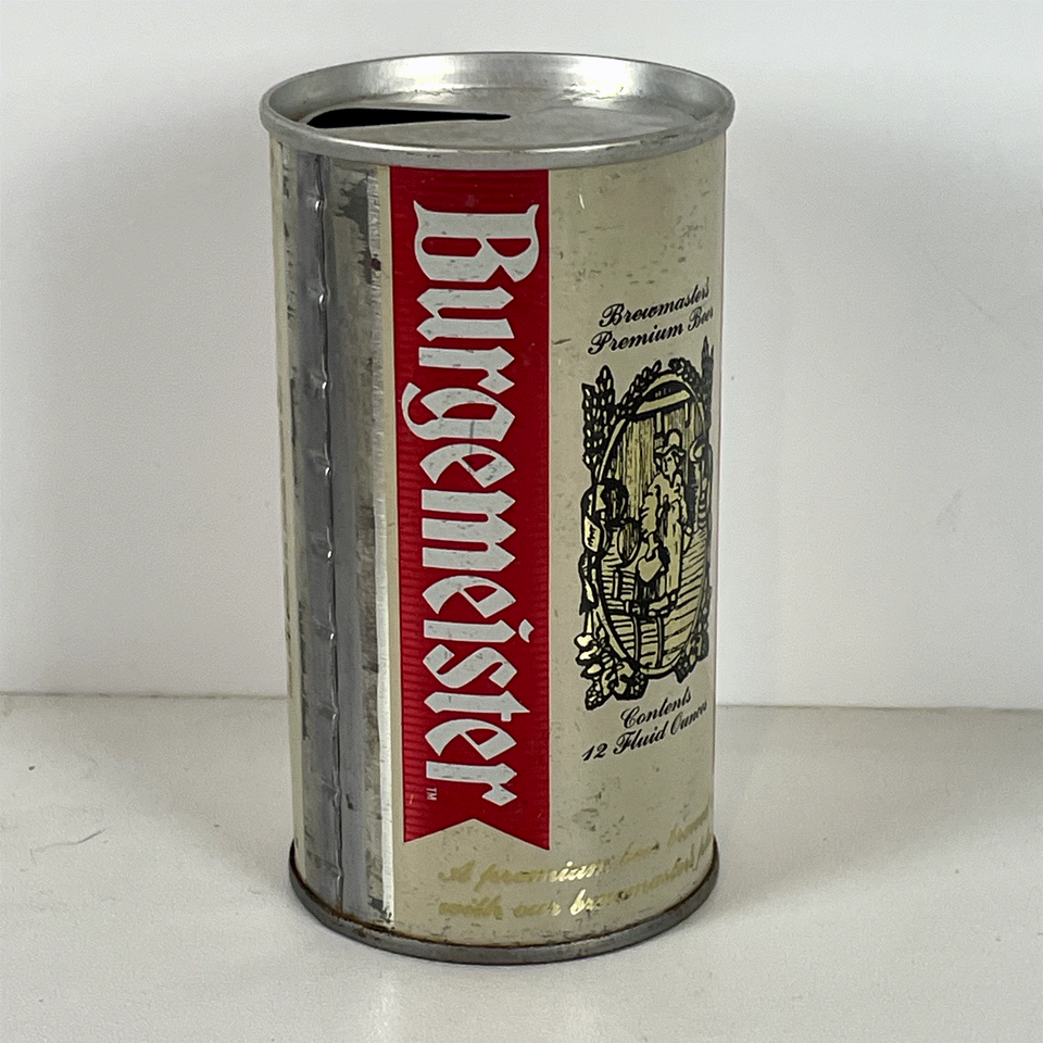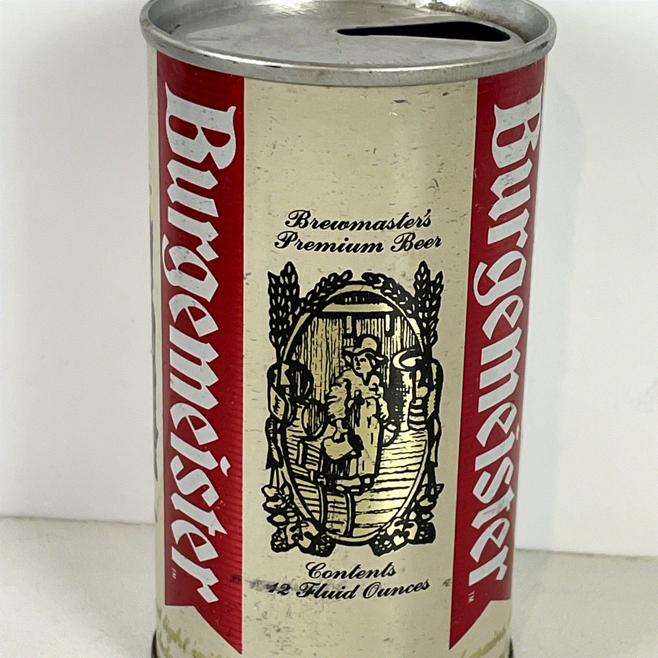 Crafted from aluminum, this 12 fluid ounce can represents a collectible treasure for beer can enthusiasts and collectors alike. Its unique top-opening style, with a large, angled pull tab, adds to its nostalgic appeal. The detailed artwork and color scheme highlight the vintage charm and historical significance of Burgemeister beer, making it a standout addition to any breweriana collection or display.