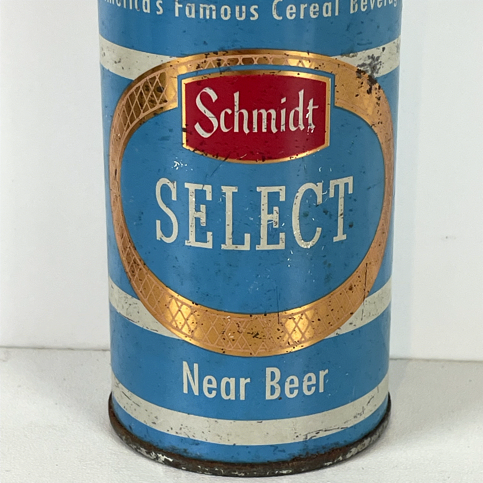 This vintage Schmidt Select Near Beer can is a true collectible piece of breweriana history. Featuring the iconic Schmidt brand logo set against a vibrant blue background with gold and white accents, this can showcases classic mid-20th century design. The gold oval frame around the brand name adds a touch of elegance and distinctiveness. Marked with "America's Famous Cereal Beverage" and "Near Beer," this 12 fluid ounce can represents a non-alcoholic beer option, typical of the era.