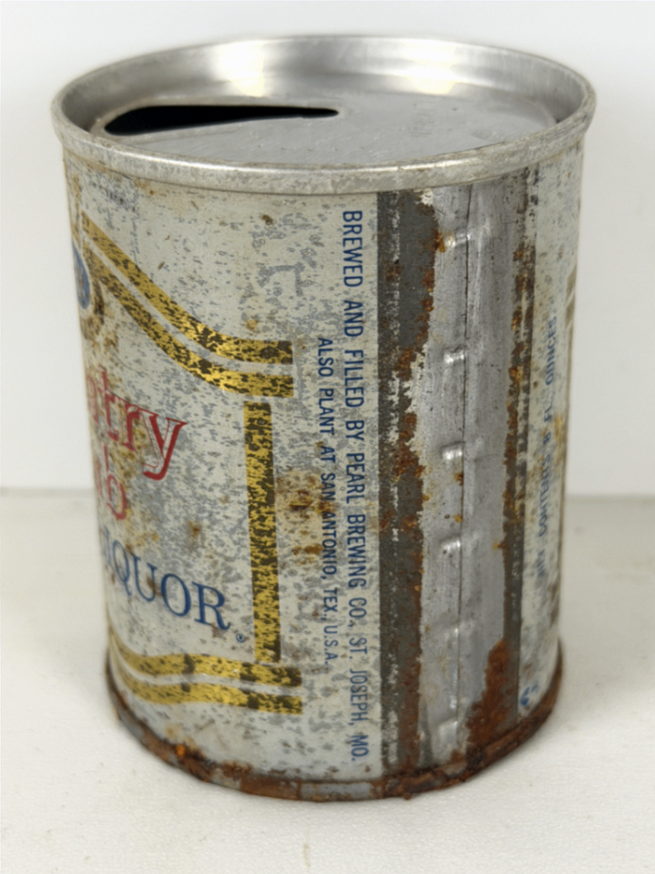 Measuring approximately 3.5 inches tall and 2.5 inches in diameter, this 8 fluid ounce container carries nostalgic value for collectors of malt liquor memorabilia and vintage packaging. Despite visible patina and rust spots that tell a story of its age, the graphics remain legible and the structure intact, making it a standout piece for display or collection. The can was brewed and filled by Pearl Brewing Co., originally in St. Joseph, MO, with an additional plant in San Antonio, TX, adding to its provenance.