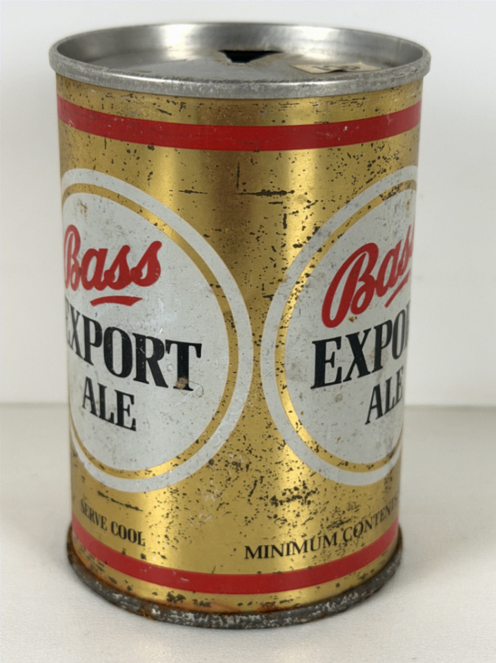 The can's surface exhibits authentic aging with natural patina and spots of rust, adding to its character and vintage appeal. The top of the can features a flat steel lid with a distinctive triangular pull tab opening, a hallmark of collectible beer cans from this era. The bottom is flat with visible signs of age and wear, consistent with a genuine vintage original piece. This Bass Export Ale can is a prized item for collectors of breweriana and vintage advertising memorabilia, offering both historical significance and decorative charm.