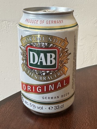 This collectible Henninger Meister Pils beer can is a vintage original from the renowned Henninger-Brau brewery in Frankfurt, Germany. Crafted from steel with a classic gold finish, it showcases the historic brewery's emblem in striking red and green colors, along with detailed embossed markings on the side seam. The label features the iconic H.B. logo surrounded by gold medallions, emphasizing its heritage as a distinguished German pilsner beer.