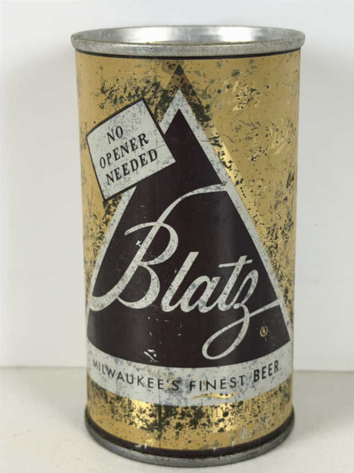 This vintage Blatz beer can is a remarkable collectible featuring Milwaukee's Finest Beer branding. Crafted from steel, it showcases a classic gold and dark brown color scheme with the iconic Blatz logo prominently displayed within a triangular design. The can is embossed with the phrase "No Opener Needed," highlighting its unique no-opening design that was innovative for its time. The steel material and embossed details add a tactile element that collectors appreciate.