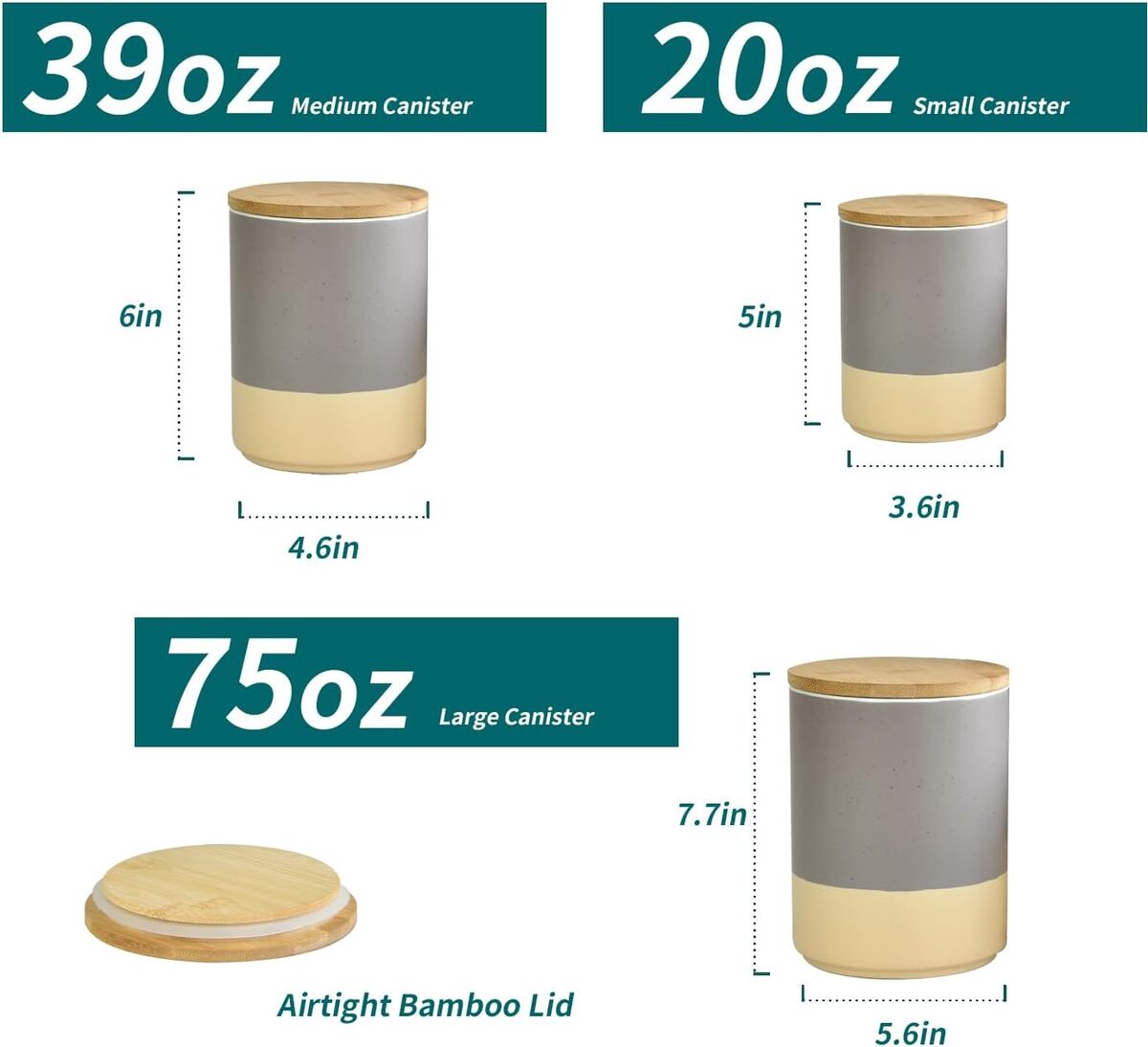3 Sizes for Versatile Storage : This set includes 3 canisters in different sizes (4.9"x3.6", 6.1"x4.6", 7.8"x5.6") with capacities of 18 oz, 36 oz, and 74 oz. Perfect for storing flour, sugar, coffee, tea, spices, and more. Note: Solid storage capacity may vary due to density differences