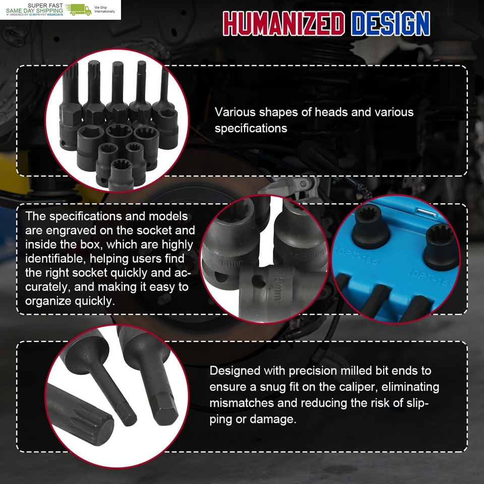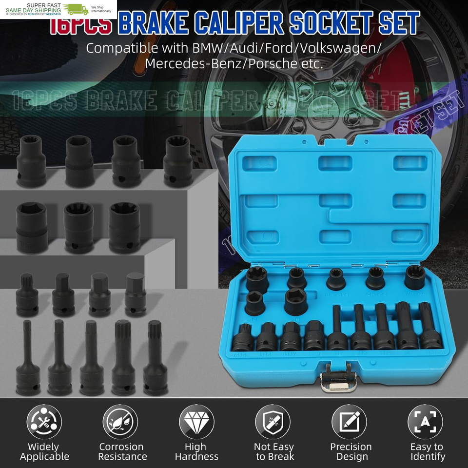 ?16 Specifications Widely Applicable?The brake caliper socket set contains 16 special sockets for different models, designed for removing/installing brake caliper screws, helping you to repair calipers or replace brake pads easily and efficiently. Brake caliper special sockets are suitable for disassembly of various models, compatible with BMW/Audi/Ford/Volkswagen/Mercedes-Benz/Porsche and other models, which is very widely used.