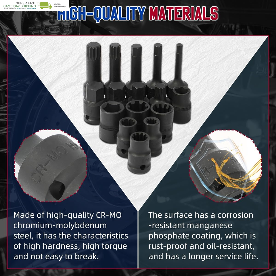 ?Anti-Rust High Hardness Precision Design?Brake caliper socket set is made of high-quality CR-MO chromium-molybdenum steel, which has the characteristics of high hardness, high torque, not easy to break, and the surface has a corrosion-resistant manganese phosphate coating , rust-proof and oil-resistant. Brake caliper socket feature precision-milled bit ends to ensure a snug fit on the caliper, avoiding mismatches and reducing the risk of slipping or damage.
