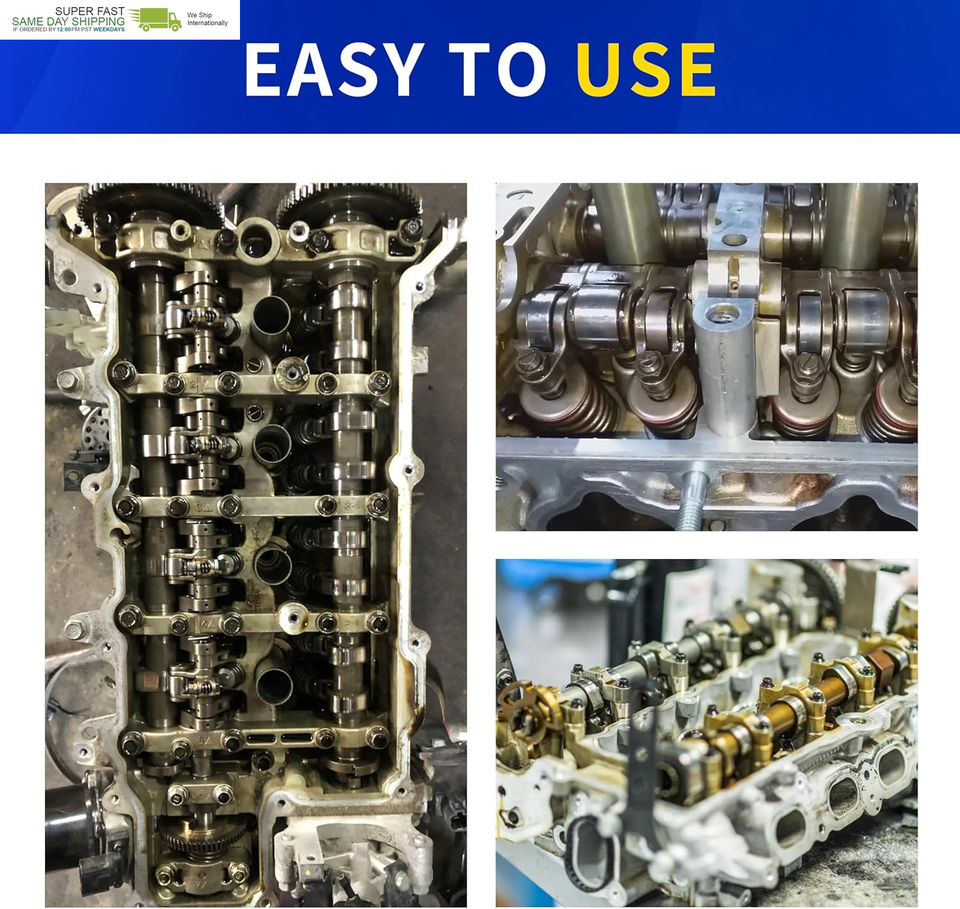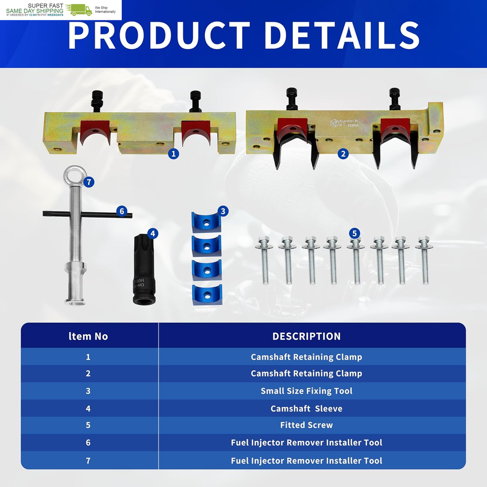 ?Set Upgrade?Camshaft holding tool kit has 17 pieces of camshaft timing tools including 2 pieces of fuel injector remover installer tool, 2 pieces of camshaft retaining clamp, 4 pieces of small size camshaft retaining clamp, 8 pieces of fixed screw, 1 piece of camshaft sleeve, and a pair of gloves.
