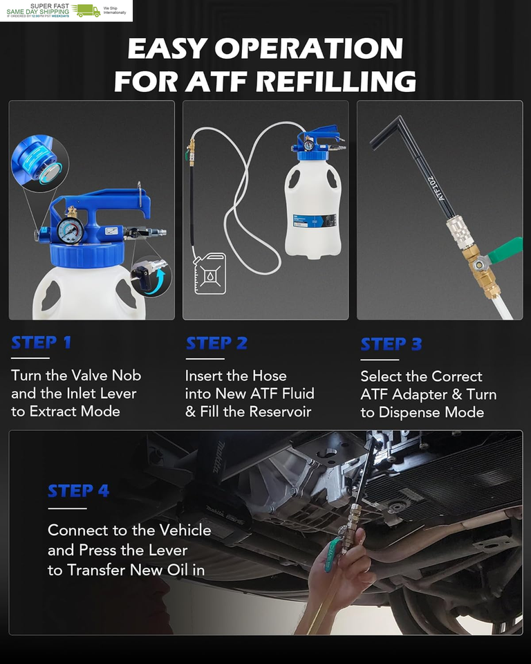 Connect the pump to an air compressor, lock the trigger, insert the hose into new ATF fluid, then press the trigger to fill the tank.
