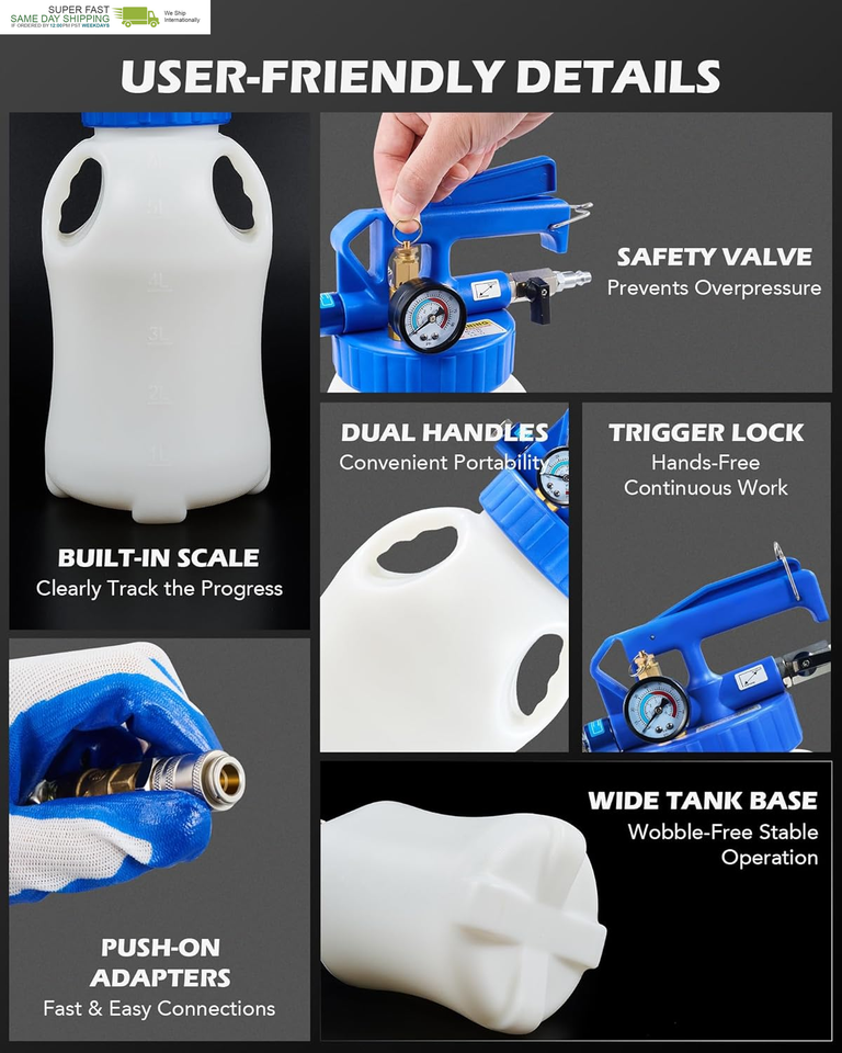 User-Friendly Design: The transparent hoses allow you to monitor progress and inspect fluid quality; the built-in pressure gauge offers real-time observation; the hangers keep things out of the way; and the gloves protect your hands from corrosive oils