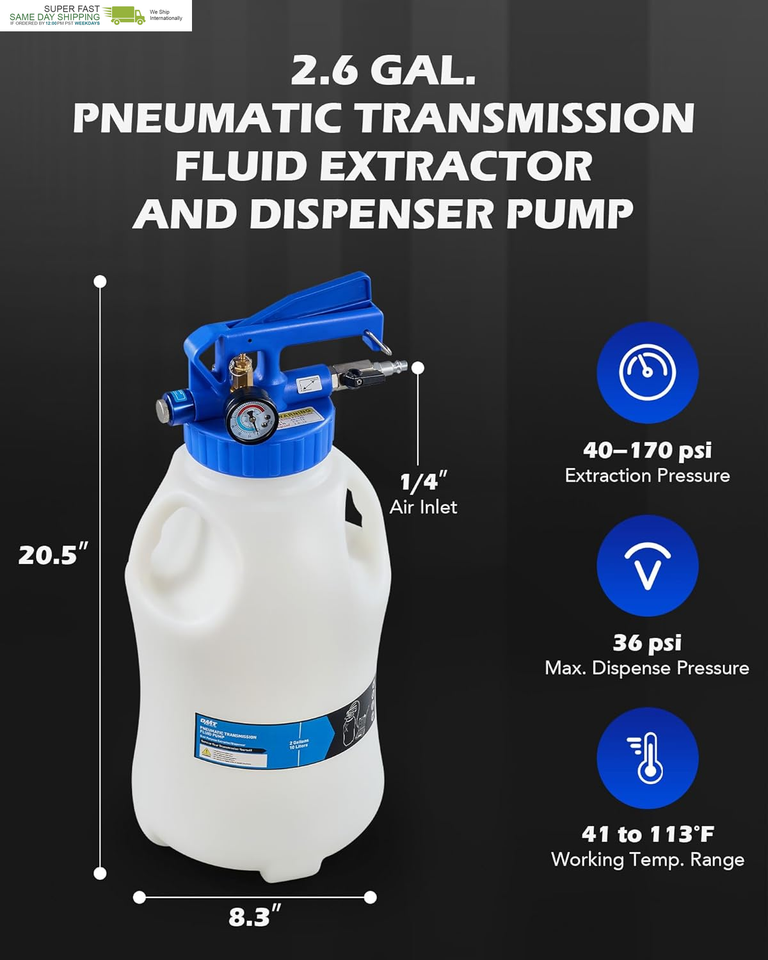 10L Extractor Dispenser: Orion Motor Tech's 2.6 gallon vacuum fluid bleeder set uses compressed air up to 170 psi to extract and 36 psi to dispense, producing strong suction with tight seals to let you handle flushes and changes quickly and easily