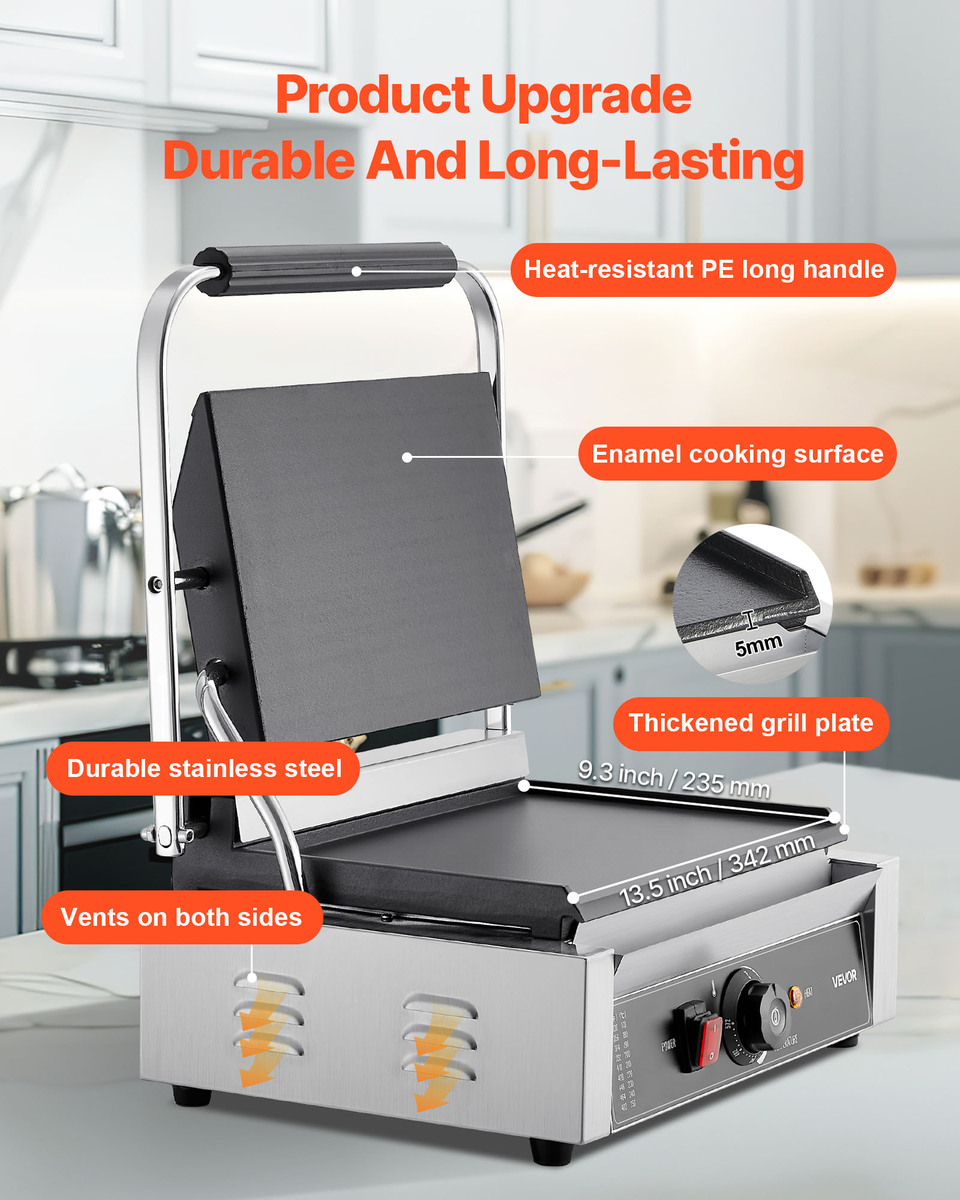 Durable and Long-lasting: This commercial panini grill features a stainless steel exterior and a thickened grill plate with an enamel coating. The extended ABS handle wont't cause burn, and the non-slip feet provide added security