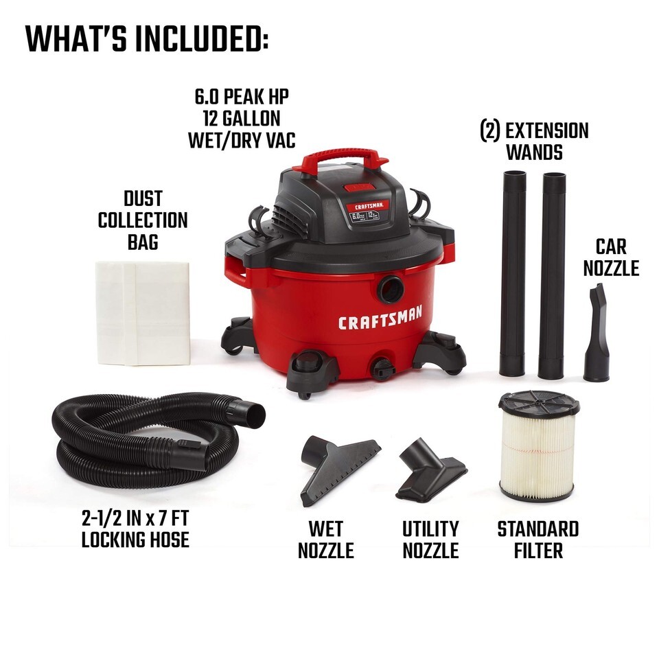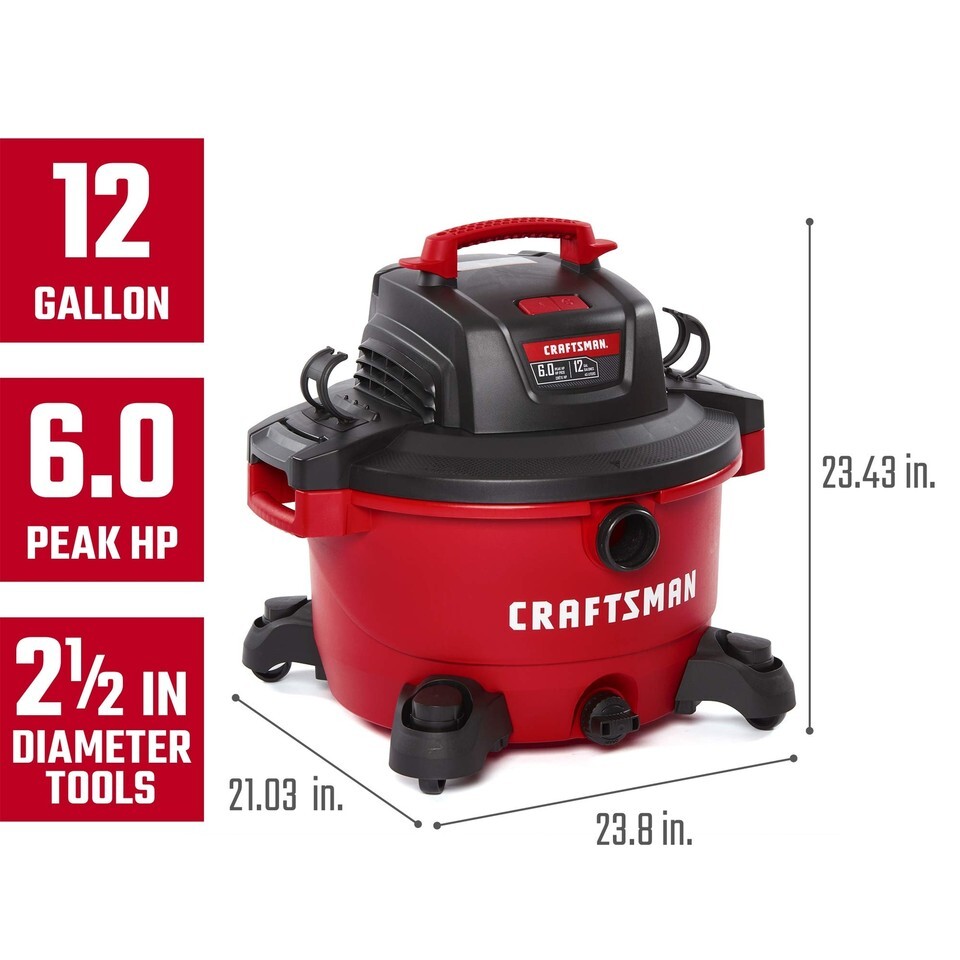 The CRAFTSMAN 12 Gallon Wet/Dry Vac, featuring a powerful 6.0 peak HP motor, is our most compact high performance vac, great for tackling medium to large cleanup projects in the garage, shop and on the jobsite. This vac can handle any mess and gives the homeowner, garage dweller or home renovator a solid capacity for tough messes. This 12-gallon shop vacuum is equipped with a large 2-1/2-inch diameter hose that allows for larger pickups and features Dual-Flex that adds flexibility at each end. On-board hose storage plus accessory and power cord organizers help eliminate unneeded hassle and reduce overall storage space. The Qwik Lock Filter Fastening System allows for quick and easy wet dry vacuum filter changes. Equipped with an extra-large drain, it quickly empties the tank of liquids.