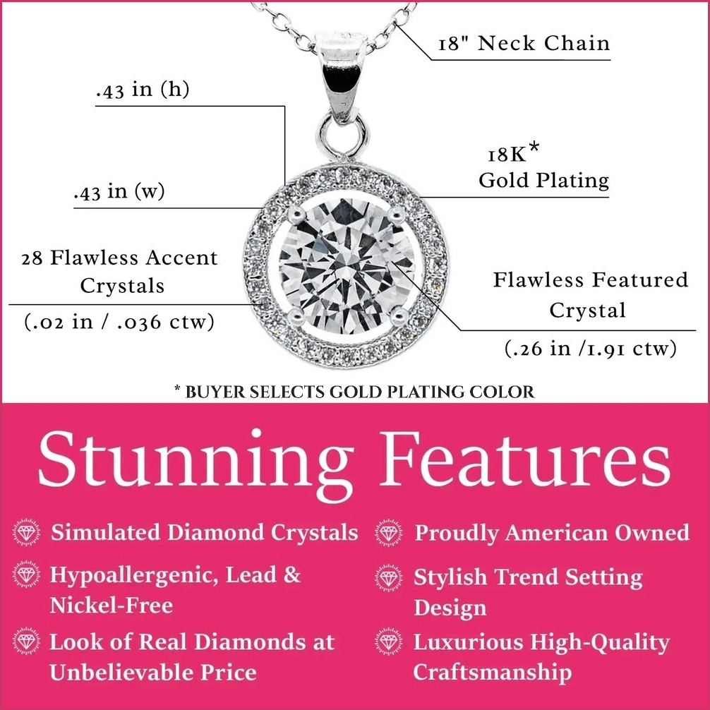Necklace Features: Expertly crafted for women from 18k White, Rose, or Yellow gold-plated brass (Buyer selection), this necklace features a 7mm (2.1 CT) round centerpiece crystal and 28 shimmering 1mm (0.14 CT) accent crystals, forming a dazzling halo design. The pendant measures 11.4mm (width) x 11.4mm (high) x 5.33mm (thick). Secured with a durable lobster clasp closure, it includes an adjustable 18-inch chain, offering a comfortable and customizable fit.