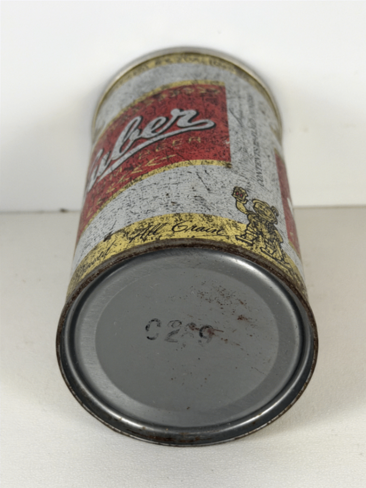 Crafted from steel, this can features a flat top with a classic pour opening, typical of mid-20th-century beer cans. The side seam and bottom markings lend authenticity to this piece of breweriana. The can also includes a small character illustration raising a beer glass, adding charm and uniqueness. This collectible is a wonderful addition for vintage beer enthusiasts and collectors interested in historic American brewery memorabilia.
