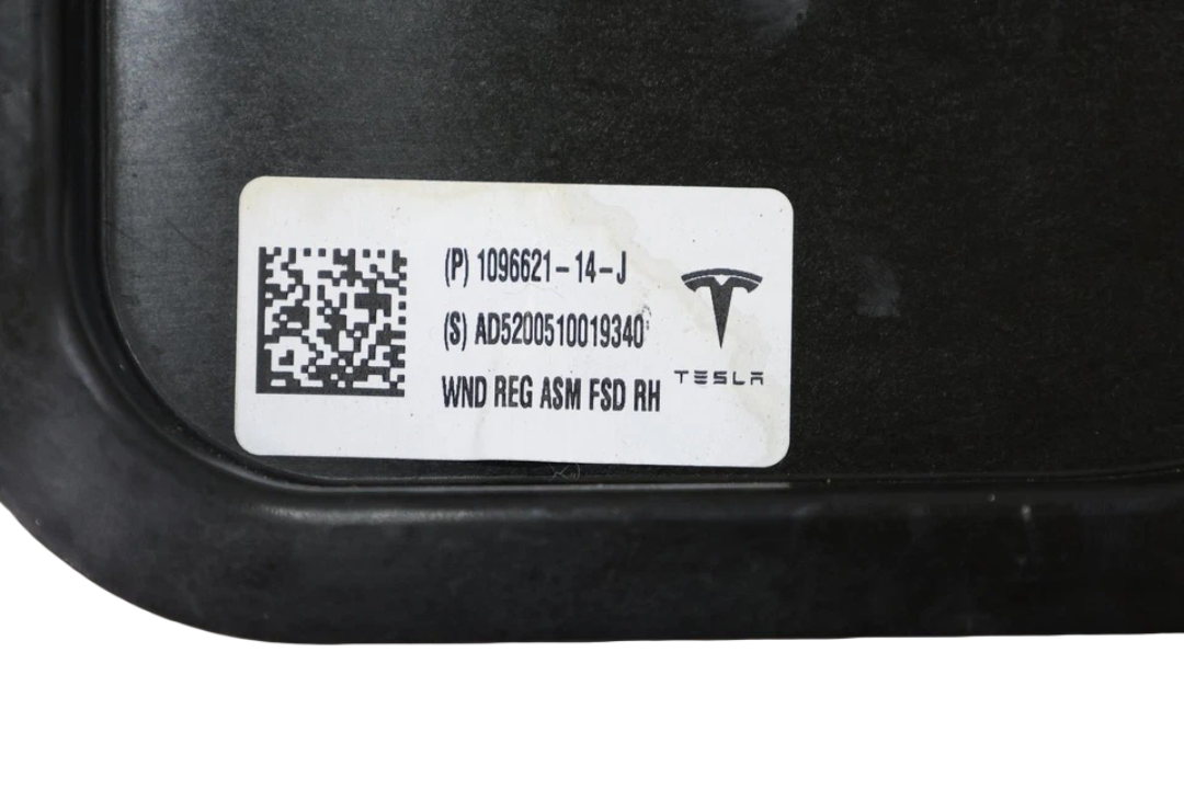 This OEM Front Right Door Window Regulator Motor Assembly fits 2017?2023 Tesla Model 3 and carries part number 1096621?14?J. It is designed to provide smooth and reliable operation of the passenger side power window, combining the regulator mechanism with the motor for efficient performance. The assembly is in good used condition with normal wear from use, showing no cracks, broken components, or damage, and all mounting points and electrical connectors are intact. This is a direct replacement OEM part and will be shipped with proper tracking.