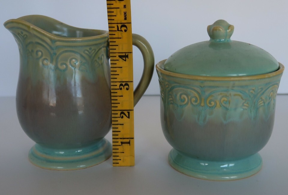 Vintage ceramic purple to green glaze creamer & sugar bowl set