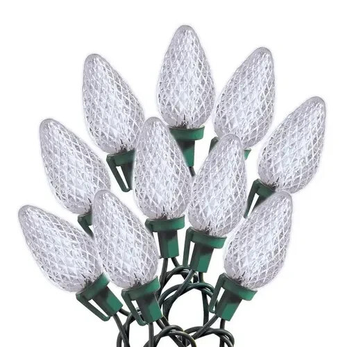 This cool white C9 LED string is used by homeowners and decorators seeking a bright, modern lighting effect for large-scale holiday displays. Commonly installed along rooflines, wrapped around mature trees, or strung across fences and railings, the faceted bulbs project a sharp, clean glow that stands out against dark backgrounds or snowy landscapes. The cool white tone complements contemporary, icy, or monochromatic decor schemes and is especially effective in urban or minimalist settings. With exceptional connectivity (up to 90 sets) and minimal energy use, it?s ideal for commercial-style residential displays or community projects where efficiency, safety, and visual impact matter. A practical, reusable choice for those who want professional-grade results without high cost or complexity.