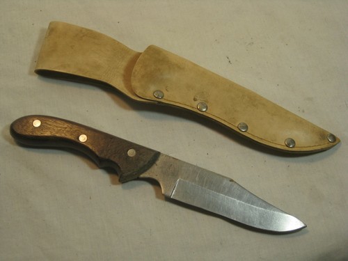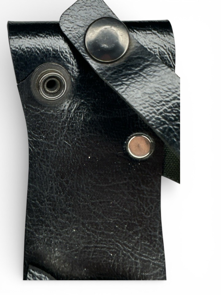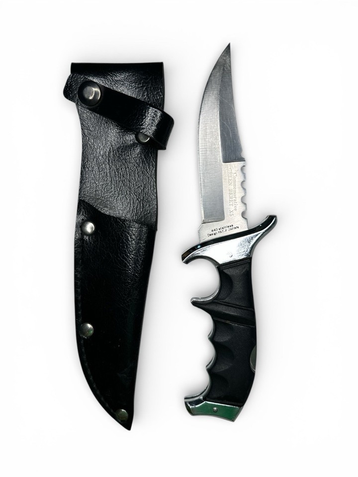 The Green Beret X5 Commemorative Knife by Saburo Japan is a handmade fixed blade knife with a 440 stainless steel blade. The blade length ranges from 4 to 6 inches, making it a versatile tool for outdoor activities or combat situations. The rubber handle ensures a comfortable grip, while the original design and materials sourced from Japan add to its collectible appeal. One side of the rubber handle is gone. The button on the sheath in the last picture has a tear in the leather. It still buttons.