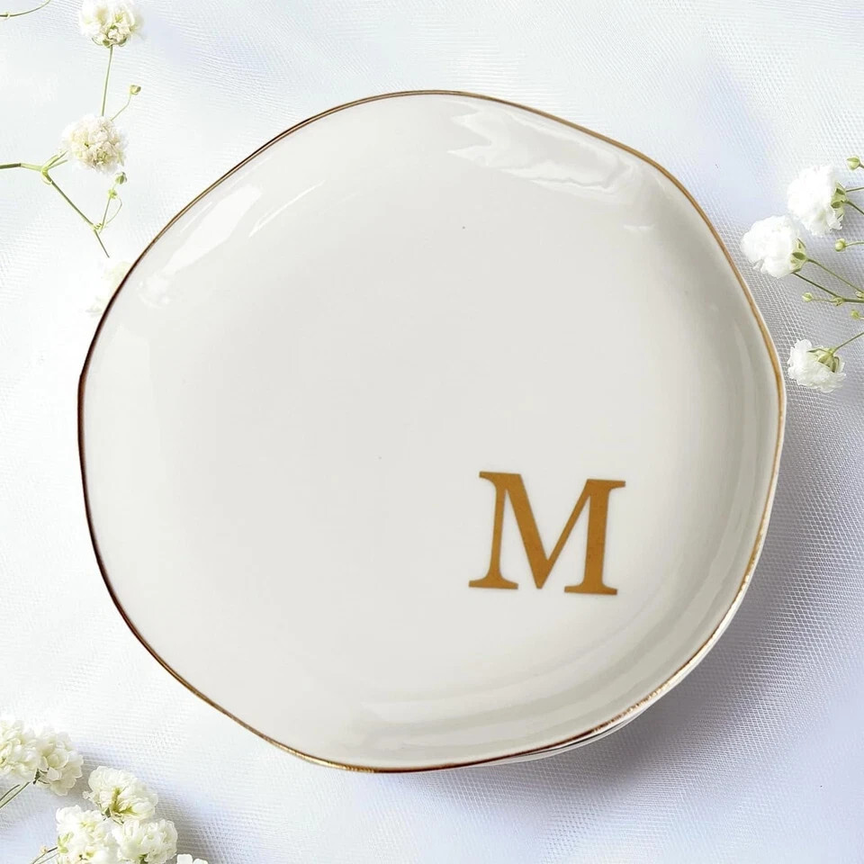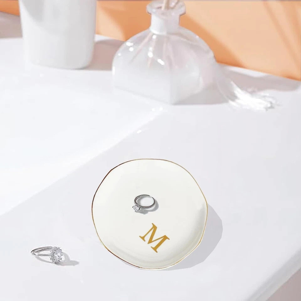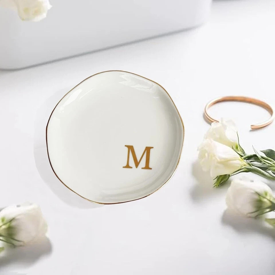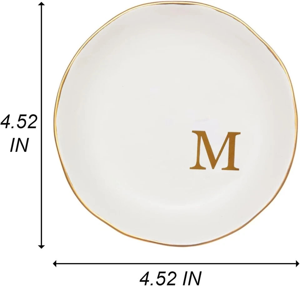 Glyxorian Ceramic Jewelry Tray 4.5" White Decorative Trinket Plate Ring Dish with Initial "M" Christmas Gift for Mom Sister Friends Birthday Present