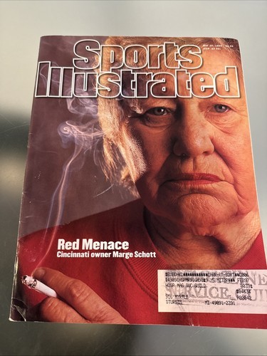 The product is a vintage Sports Illustrated magazine from May 20, 1996, featuring Marge Schott, owner of the Cincinnati Reds, on the cover. The magazine likely includes articles and photographs related to Schott's ownership of the team, as well as coverage of sports events from the year 1996, particularly focusing on the Olympics. This collectible item would be of interest to fans of both the Cincinnati Reds and sports memorabilia enthusiasts looking to own a piece of history from the 1990s.