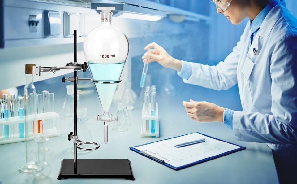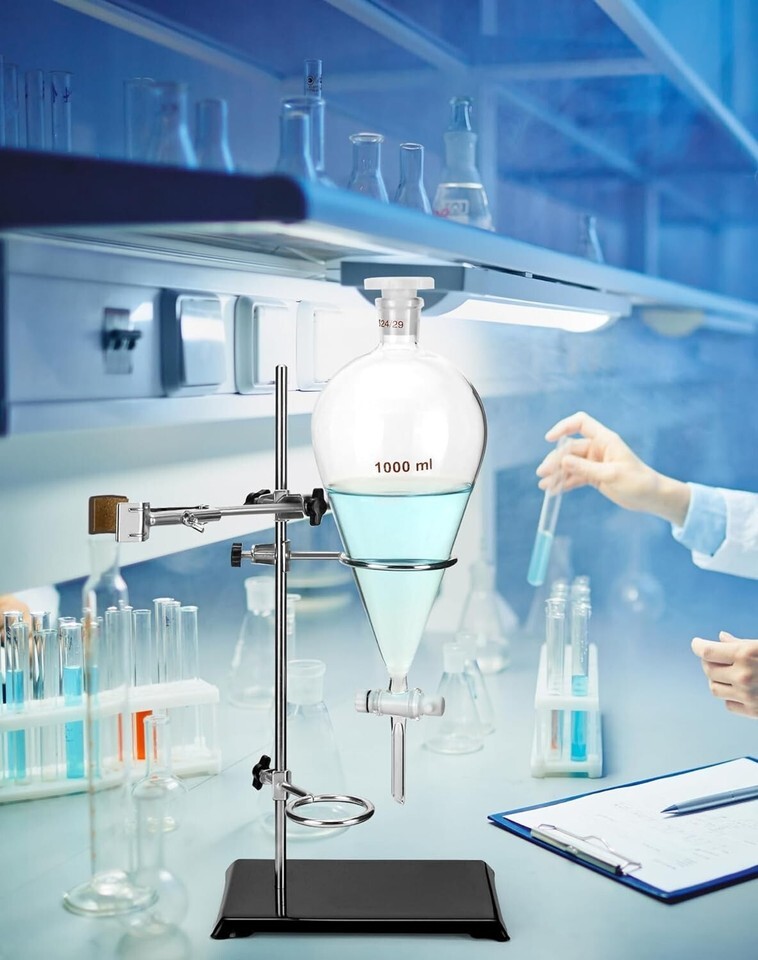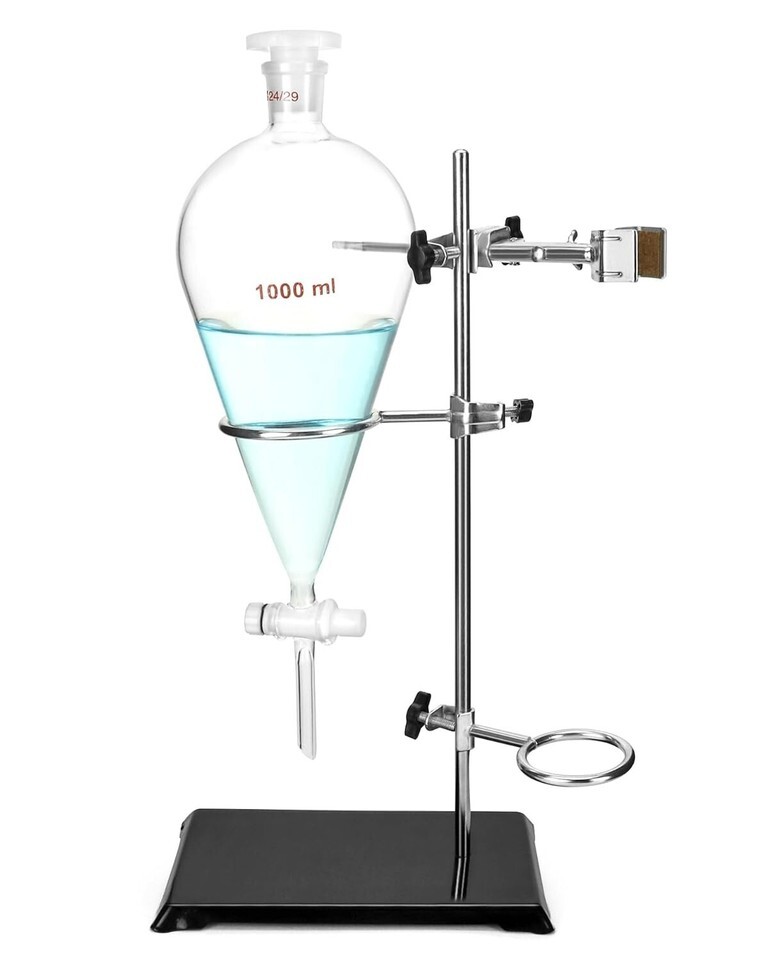 Package Includes 1 x 1000ml Heavy Wall Conical Separating Funnel with 24/29 Fitting and PTFE Stopcock + 1 x Laboratory Distillation Support Rack for Titration Extraction.