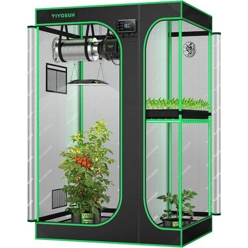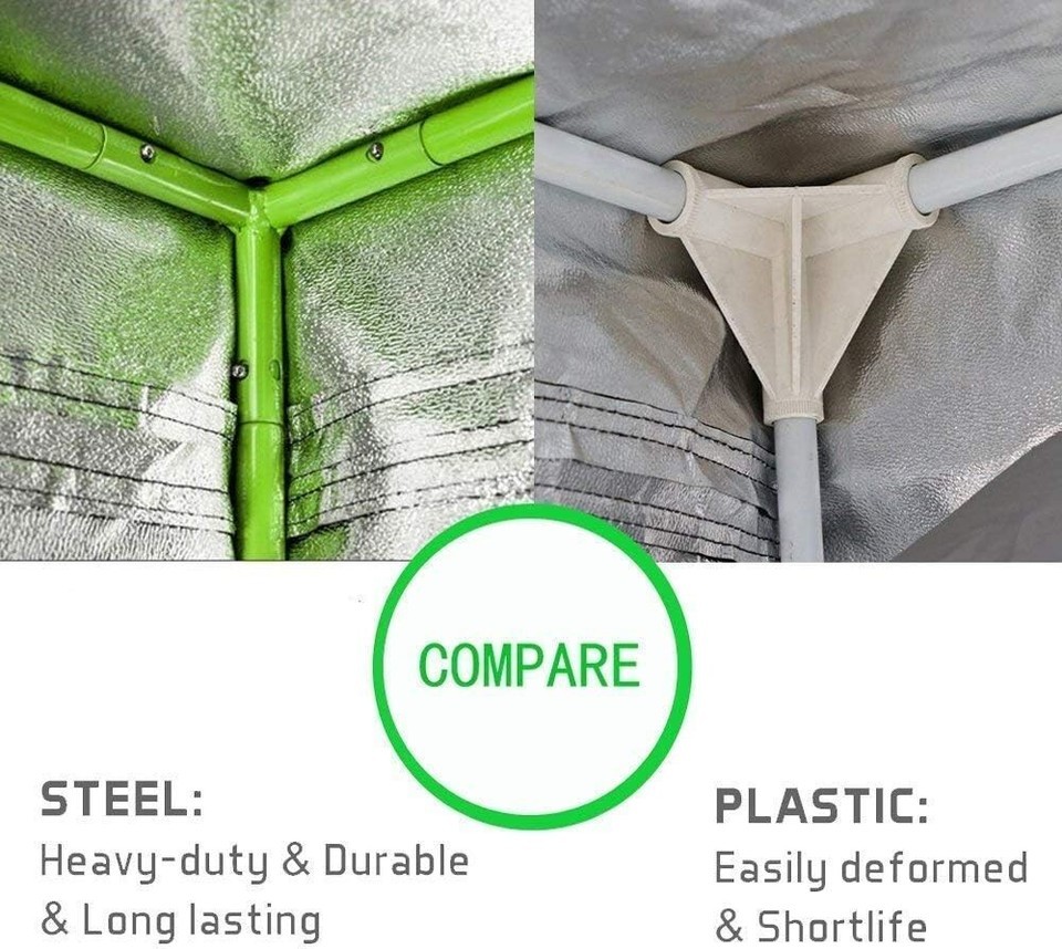 ? HIGH QUALITY PVC FREE: hydroponics indoor growing tent with heavy-duty zippers and double stitching for light protection ensure durability and long-lasting use. And we use peva environmentally friendly materials, which is PVC free. 600D Thick tent material reinforced by the metal poles ensures security and stability.