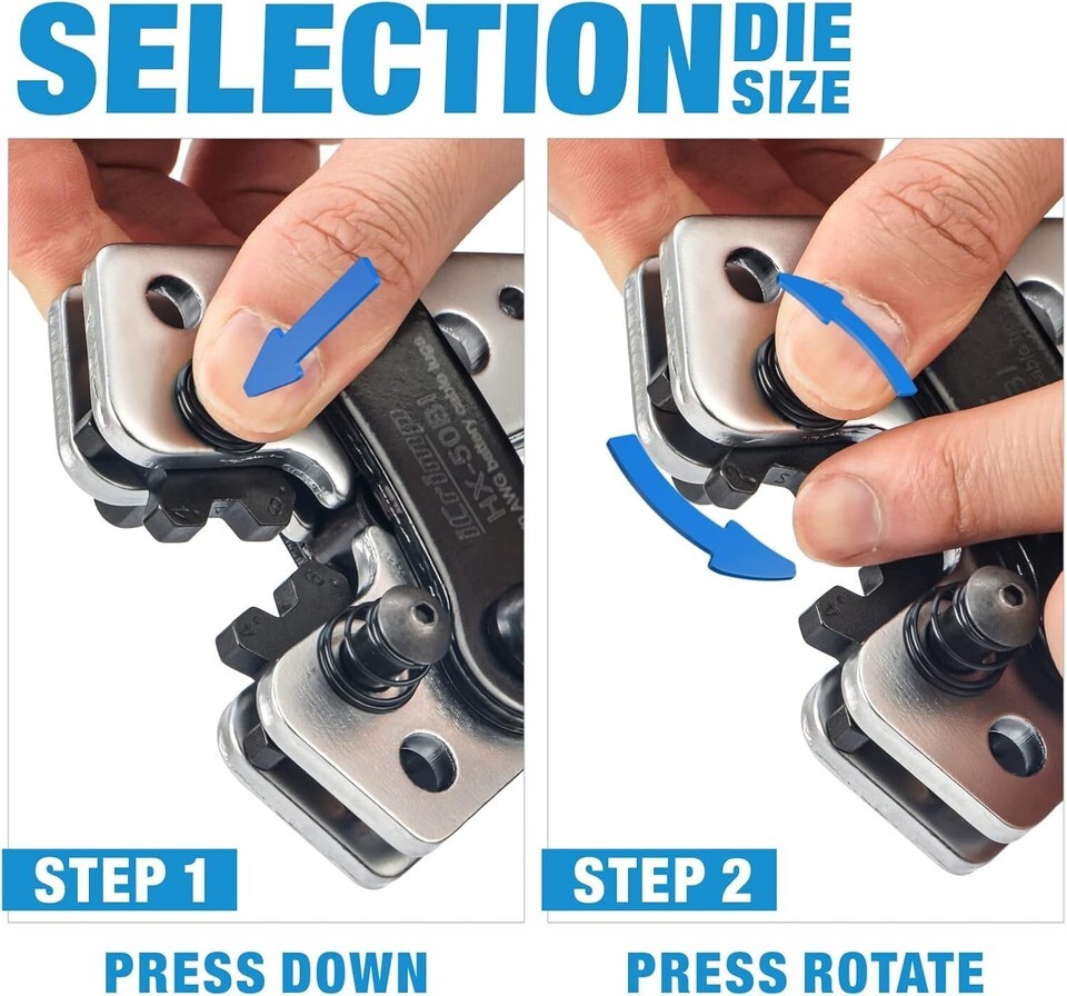 [Rotating Die Set] Compared to stamped dies, EDM cutting dies are more dimensionally accurate and reduce incorrect crimps. Rotating die is compact for quick die changes. When size coded crimping done correctly, the connector will have the die code number embossed on it so that it can be quickly checked to see if the right die and connection were used.