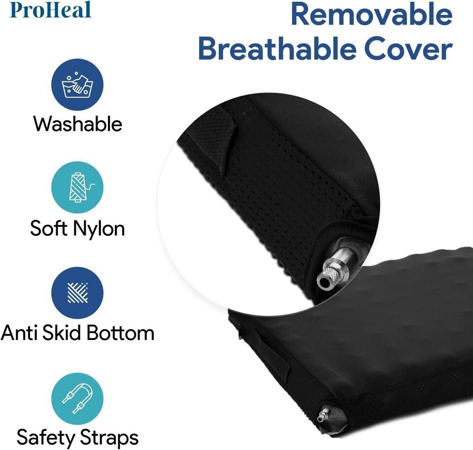 SUPERIOR COMFORT: The removable and washable nylon cover is super breathable to improve comfort. The non skid bottom and safety straps ensure it remains in place and does not slide around. The soft interconnected air cells provide low pressure across the entire surface.