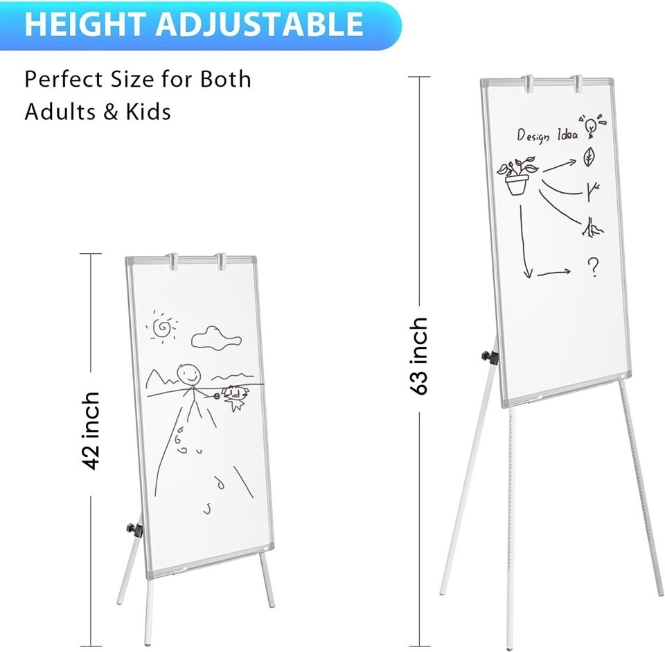 Adjustable Height: There are scale markings on the tripod legs of the flipchart easel board, which help adjust the height and balance the white board easily and accurately from 42-63 inches. Whether sitting or standing, whether kids or adults, you can find the most comfortable height you like