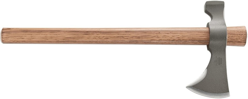 Build a Nice Log Cabin Fire. Heck, Build a Nice Log Cabin two-handed camp axe with a hickory handle, hot forged blade, and hammerhead will make your life easier when you?re off the grid. Ryan Johnson of RMJ Tactical in Chattanooga, TN designed The Woods Chogan T-Hawk. A specialist in applying modern engineering to centuries old tool and weapon concepts, he is upping the ante once again with a new outdoor line of tomahawks that swing as big as the open wilderness where they?re design for this T-Hawk evolved from the popular and original tactical tomahawk series. But it?s built for battle with a few old Doug Firs. The Woods Chogan is made from a solid chunk of 1055 carbon steel that is hot forged into a rock-solid head that features a hammer finish. With primary and secondary edge bevels that are flat ground, it cuts through timber like a beaver. A hammerhead is useful for pounding in nails and stakes for the tent you?ll put by your roaring fire. The thick wood handle is made in the USA from Tennessee hickory. It's comfortable in hand and sealed with a lacquer coat that adds durability whenever you're in the backcountry?in other words, all the hold of the Woods Chogan T-Hawk and split some wood?like a cord?s Leather sheath is available as an after-market add-on. It is not included. But don?t worry. You won?t want to keep this baby wrapped up.Specifications:Blade Length: " ( mm)Edge: Axe w/HammerSteel: 1055 Carbon SteelBlade Finish: Clear LacquerBlade Thickness: " ( mm)Open Length: " ( mm)Weight: lb ( kg)Handle: Tennessee HickoryStyle: Tomahawk