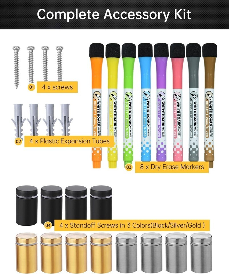 Colorful Accessories Included: Comes with 8 vibrant dry-erase markers, a handy eraser, and a choice of three colors for standoff screws to match your decor.
