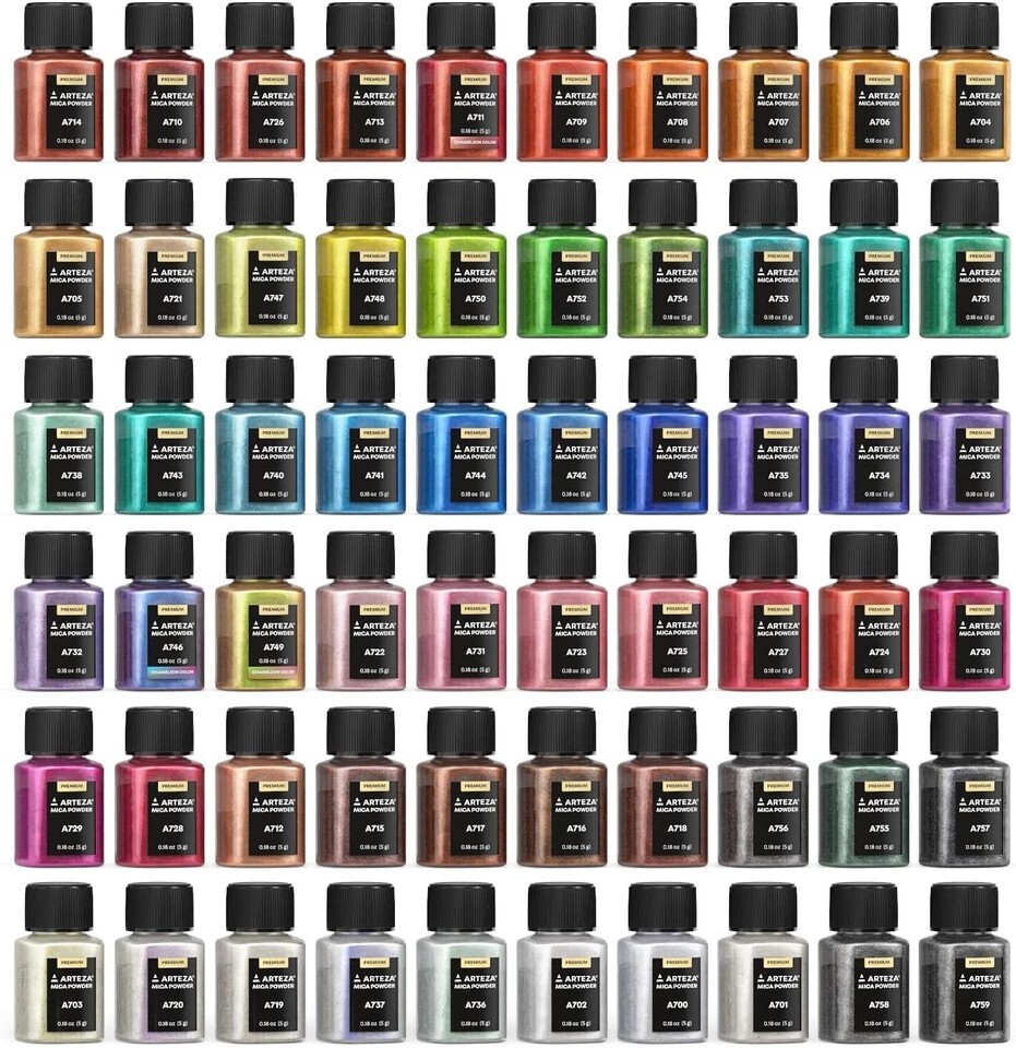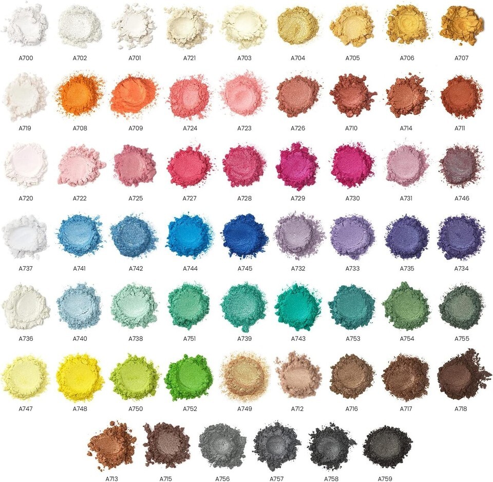 Large Variety of Unique Mica Powder Colors: You?ll get 60 unique colors with 3 chameleon and 57 metallic mica powder shades to add an eye-catching effect to your crafts. Each color comes in a oz / 5 g bottle.