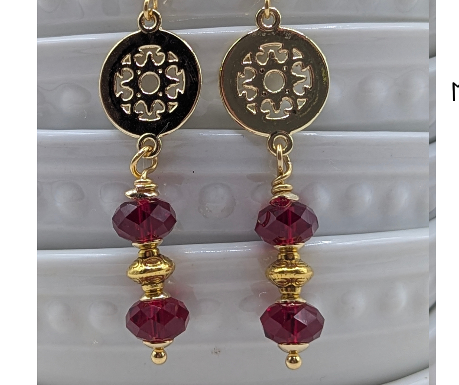 Introducing the Arabian Nightfall Earrings — enchanting ruby Swarovski crystals paired with ornate golden accents and a beautifully detailed gold medallion. These earrings feel like treasure discovered beneath hanging lanterns in a night bazaar — rich, romantic, and a little mysterious.