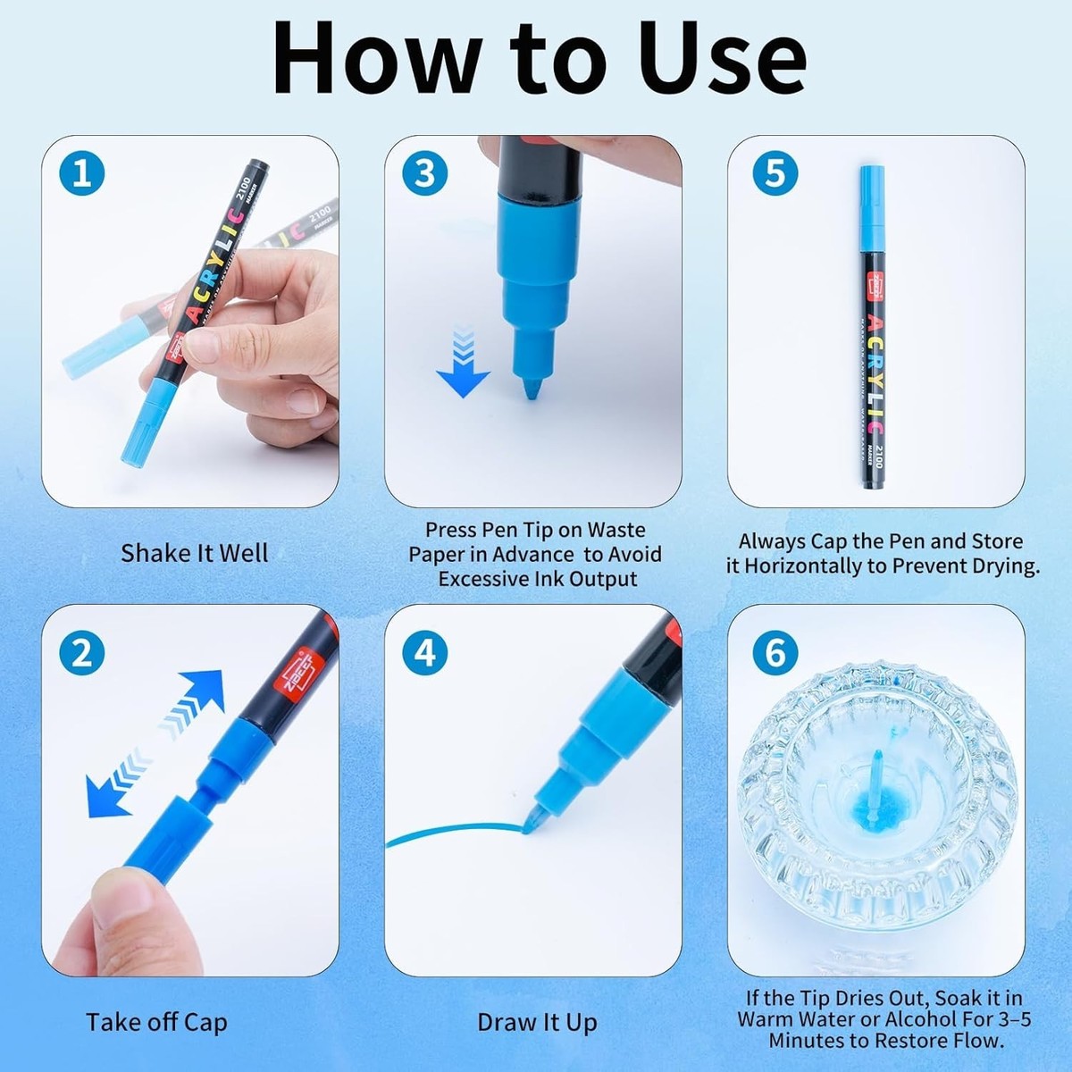 Usage Storage Tips: Shake the capped pen for around 20 seconds before first use. Uncap, press the tip upward for 5 seconds to release air, then on paper until ink flows. After use, recap and store the pen flat. For any problems, out to us?we?ll reply within 24 hours.
