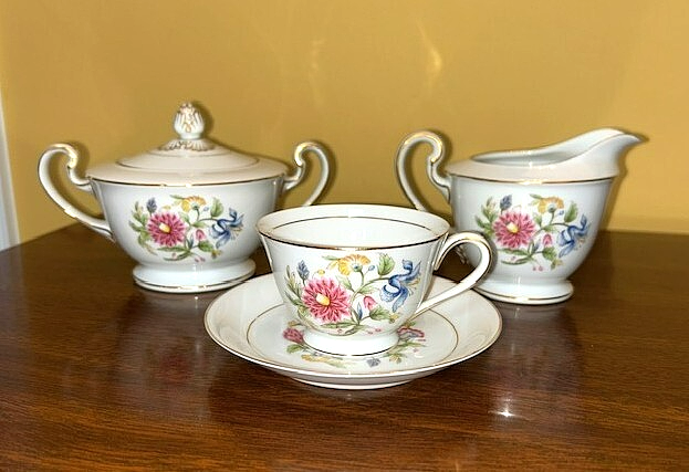 Made of white bone china, this pattern features a center floral pattern in Green, Pink and Blue with elegant Gold Detailing.