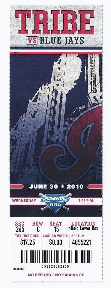 2010 Blue Jays @ Indians Full Unused Ticket June 30th Progressive Field