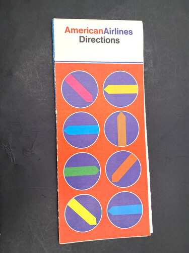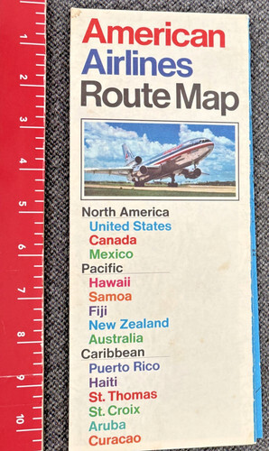 Opens to about 21" x 36". On one side is a Colorful American Airlines North America System Map with smaller maps of the Caribbean NAtions, and other information, On the other side are International Route maps and Pacific Island maps and more. Circa early 1970's
