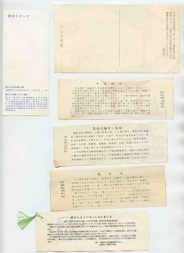 6 Different Colorful Japan Tourist Attraction Souvenir Tickets , circa 1980's. Each measures about 2 1/2" x 5 1/2". . One is actually also a postcard