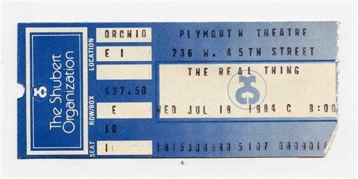 A ticket Stub from a performance at the Plymouth Theatre in New York City of The Real Thing on July 18, 1984