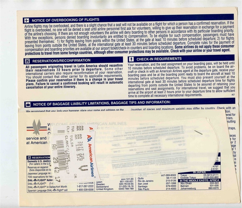 American Airlines Business Class Ticket Jacket Ticket Boarding Pass Stub Bag Tag