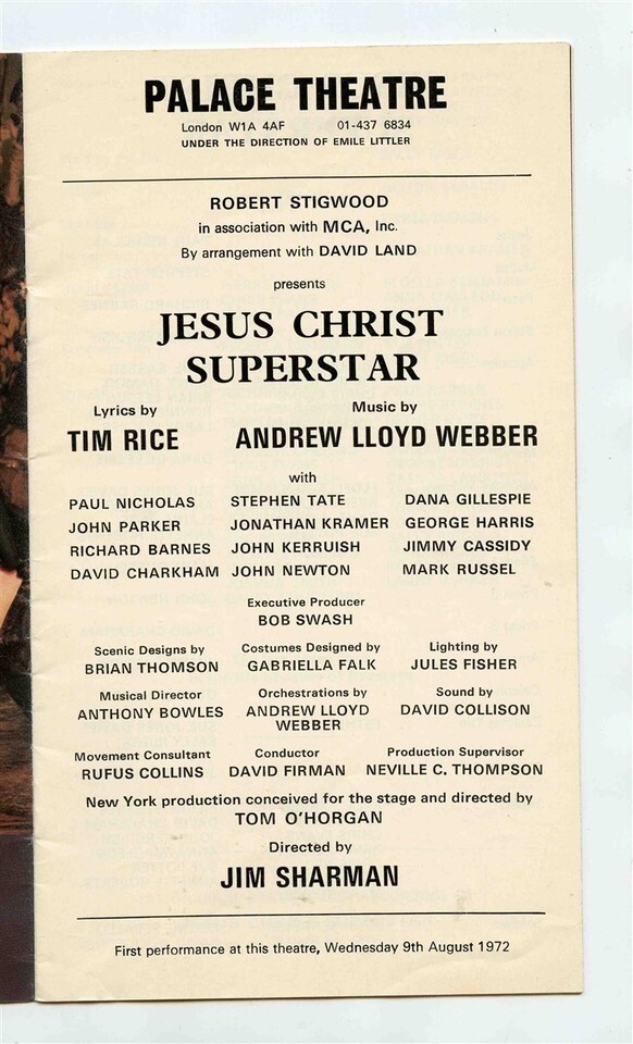 A Jesus Christ Superstar Theatreprint Program. From a performance at the Palace Theatre in London