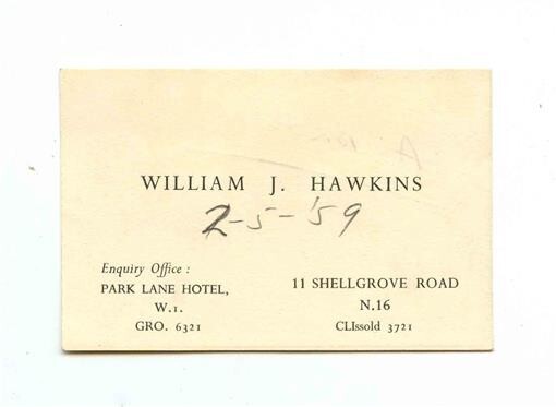 A William J Hawkins Business Card Enquiry Office Park Lane Hotel London W1. Has name A Brown written on the back in pencil.