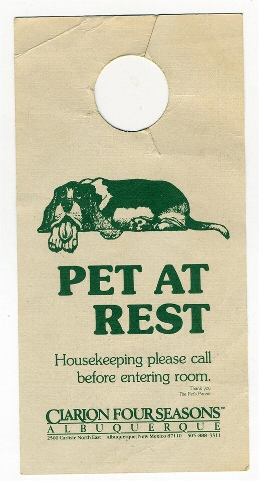 A Hotel Door Hangar with Pet at Rest on one side and Parents of Pets on the other side. To warn housekeeping that there is an animal in the room. In good condition with a small hole tear and some creases. From the Clarion Four Seasons Hotel in Albuquerque New Mexico.
