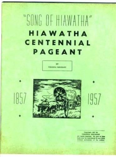 A Song of Hiawatha, Hiawatha Centennial Pageant by Virginia Reichart. This is a Souvenir Program from 1957 . In fine condition with some cover edge foxing. Printed by the Hiawatha Daily World Print in July 1957. 34 pages with full script and stage notes, including the real name and characters they play in every scene. A complete list of the members of the Hiawatha Centennial Committees, a Centennial Poem by Mrs Don Cowan, a list of all of the members of the Pageant Committees, The Pageant Cast and more. From the centennial of Hiawatha, Kansas