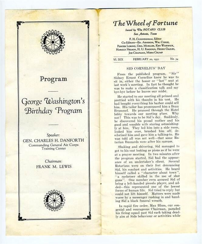 The Wheel of Fortune, February 20, 1931 Rotary Club of San Antonio, Texas, George Washington's Birthday Program. 8 pages and in very good condition with cover stains and edge wear. The Speaker was General Charles H Danforth, the Commanding General Air Corps Training Center at Randolph Field.