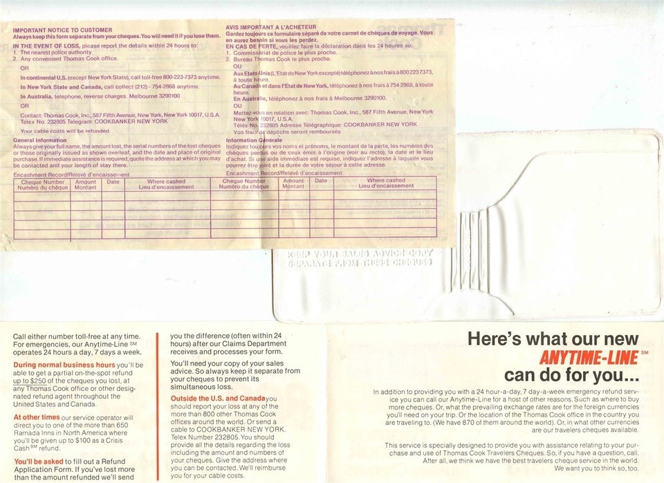 Thomas Cook Travelers Cheques Folder Sales Advice & Anytime Line