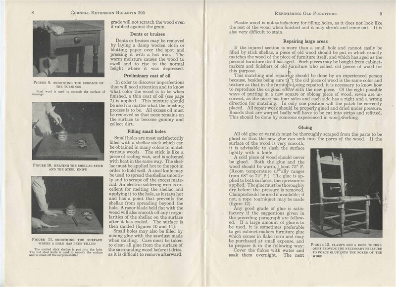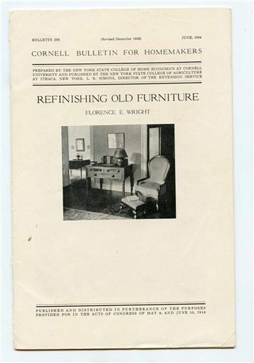 A 28 page well illustrated soft cover booklet. Bulletin 295 June 1934, revised December 1938. Cornell Bulletin for Homemakers, Refinishing Old Furniture. By Florence E Wright